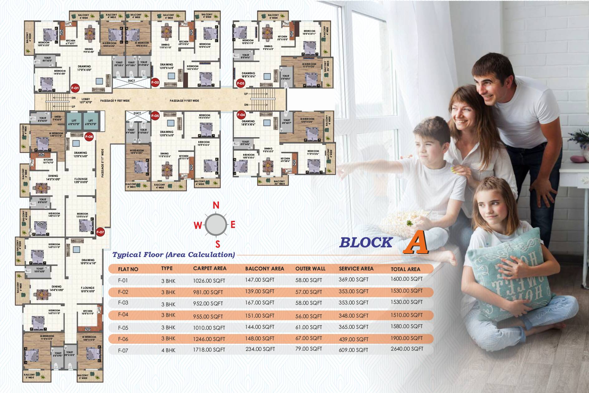 | F07-4BHK | 1718.00 SQFT | 234.00 SQFT | 79.00 SQFT | 609.00 SQFT | 2640.00 SQFT |
